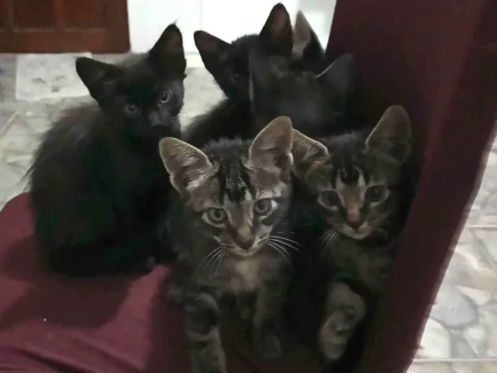 São cinco filhotes,duas fêmeas e dois machos de dois meses,já come ração,uma pretinha peludinha ,uma preta rajadaum pretinho,e dois preto e rajado .