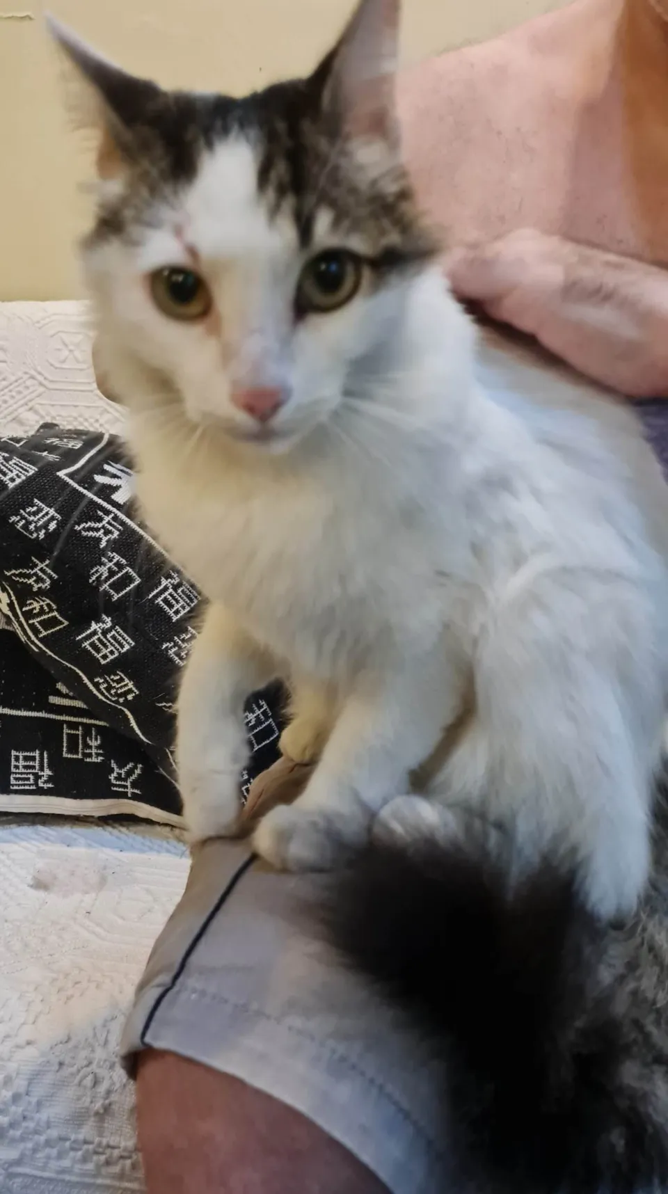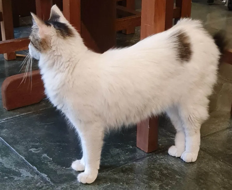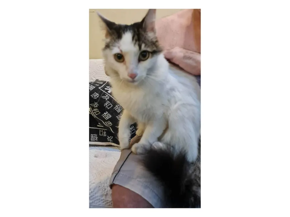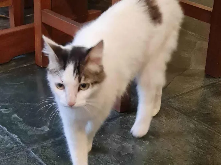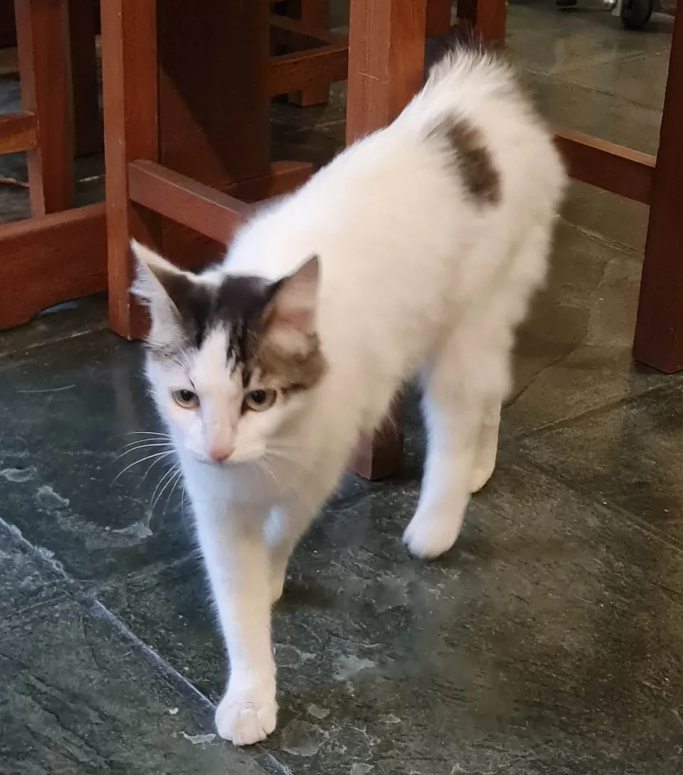 Gata de pelo branco e altura mediana com a cabeça, o rabo e uma mancha nas costas rajados/acinzentados e olhos amarelo/claro, ver fotos.