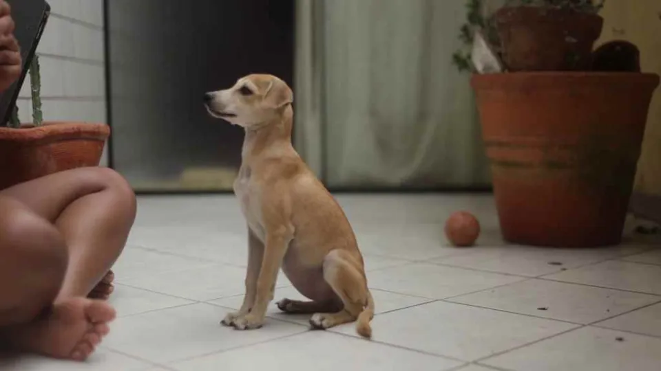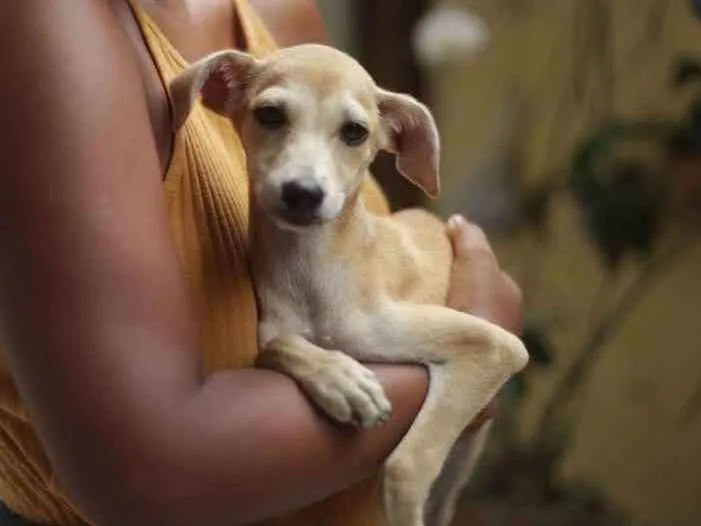 Segura, agora ela já age como uma filhote de aproximadamente 4 ou 5 meses. Corre, brinca, come bem, se dá bem com gatos e cachorros e já está aprendendo a sentar quando lhe pedem.
