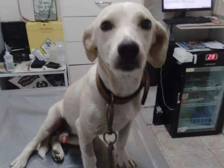 Cão sofreu fratura de fêmur, foi operado, tb castrado,muito alegre e dócil.