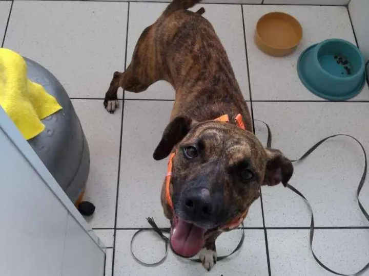 encontrei esta cadela dia 17/03/2020 em frente a igreja são judas Tadeu no marapé, tem uma mancha branca no peito e nas patas, estava com uma coleira laranja