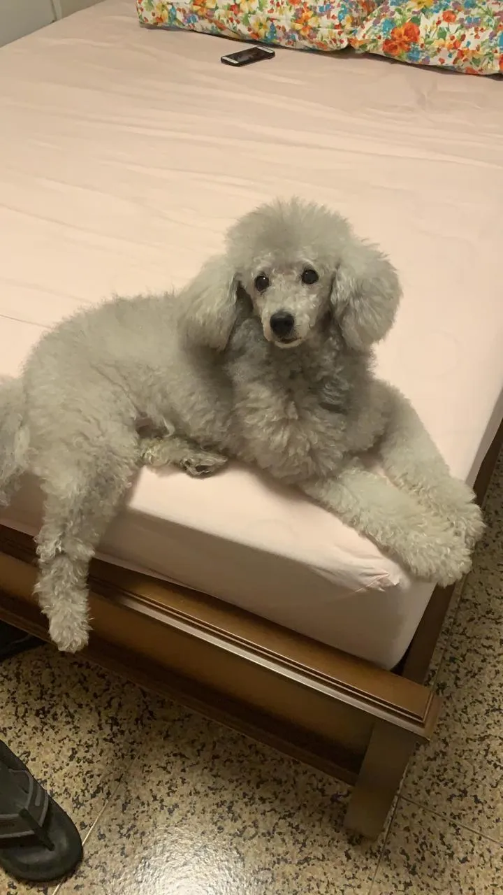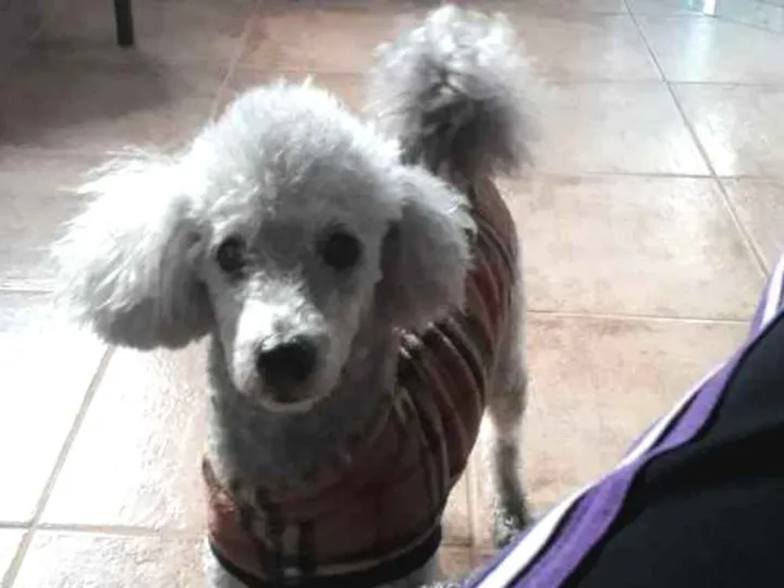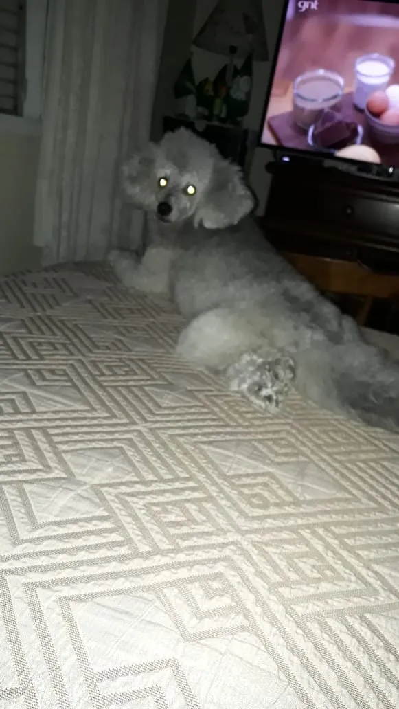 MACHO, CASTRADO, COM RABO, ESTA TOSADO, ESTAVA COM ROUPINHA XADREZ MARRON E VERMELHA E BRANCA