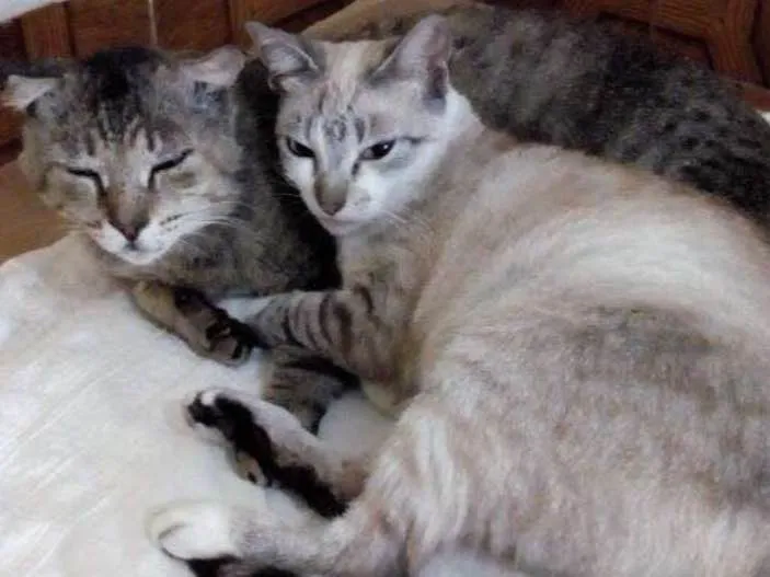 Tigrado super idoso e siamesa nova vivem grudados. Sua dona morreu e continuam tristes na casa. Castrados e extremamente dóceis. Doados para apartamento telado em SANTOS.