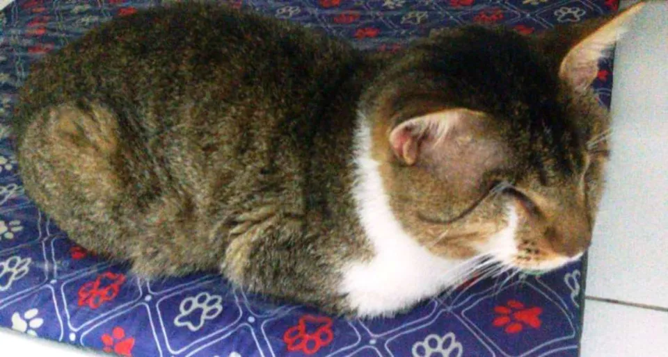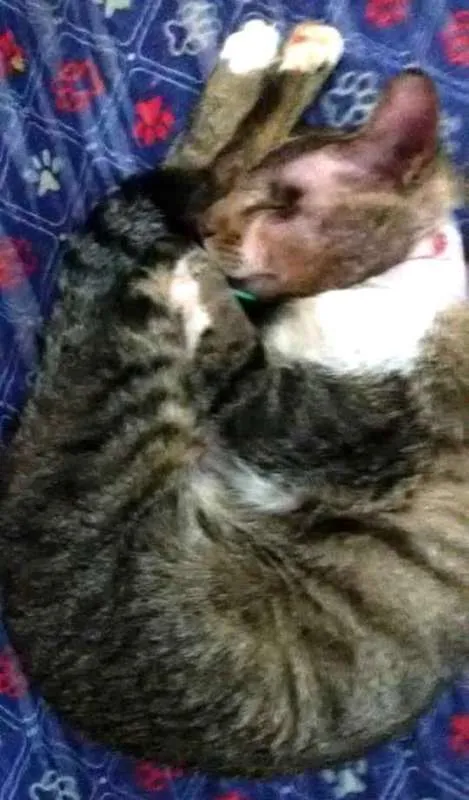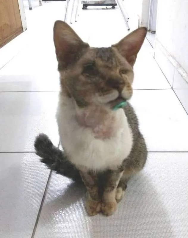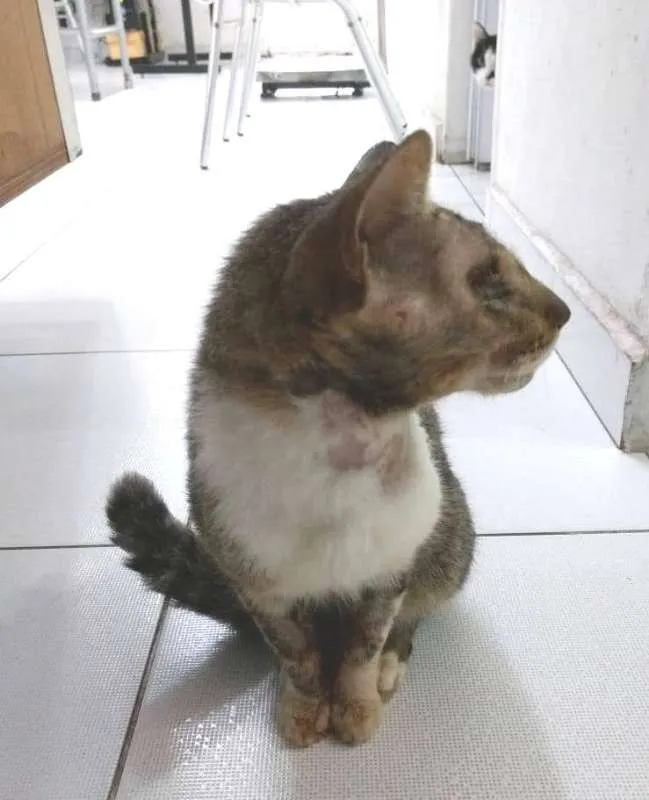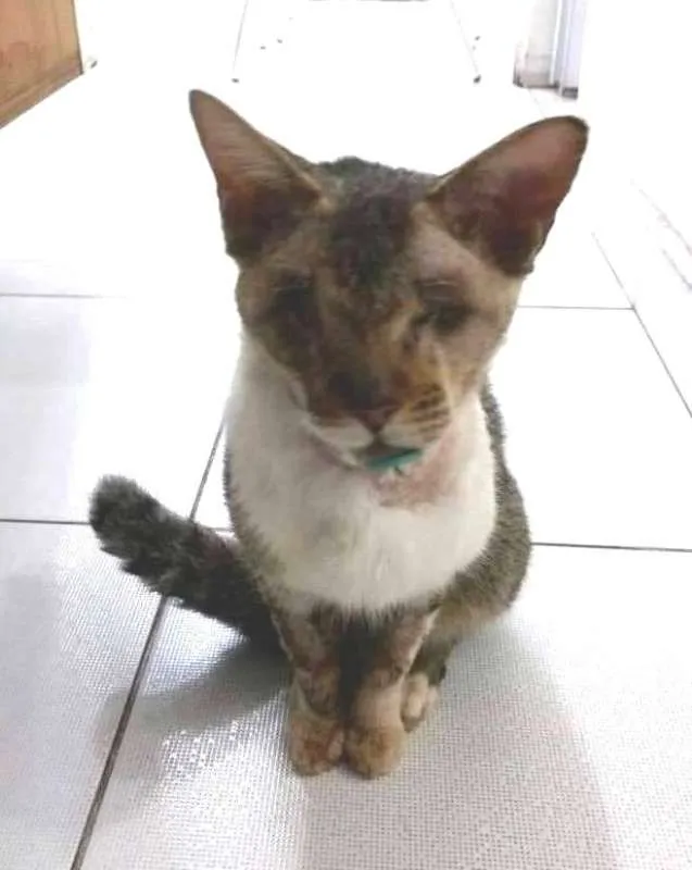 Encontrado desfalecido, sem ajuda por dias na rua, foi resgatado e está recuperado. Ficou cego, está castrado, é bonzinho e sociável com outros animais.Doado para apartamento telado em SANTOS (peça o formulário de adoção por e-mail).