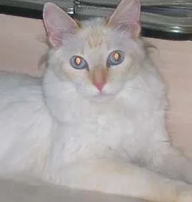 Fugiu no bairro Boqueirão em SAntos, próximo à Casa de Saúde. É branca com orelhas e rabo amarelos e olhos azuis.Tem um ano.
