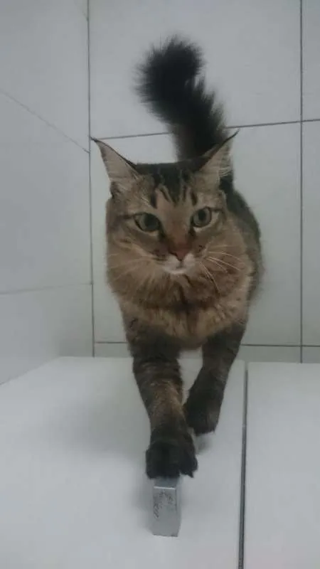 Fêmea, 3 anos e meio, castrada, cor rajada, peluda.