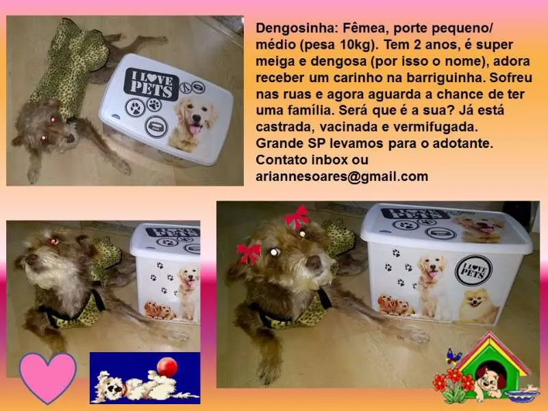 Dengosinha: Fêmea, porte pequeno/ médio (pesa 10kg). Tem 2 anos, é super meiga e dengosa (por isso o nome), adora receber um carinho na barriguinha. Sofreu nas ruas e agora aguarda a chance de ter uma família. Será que é a sua? Já está castrada, vacinada e vermifugada.