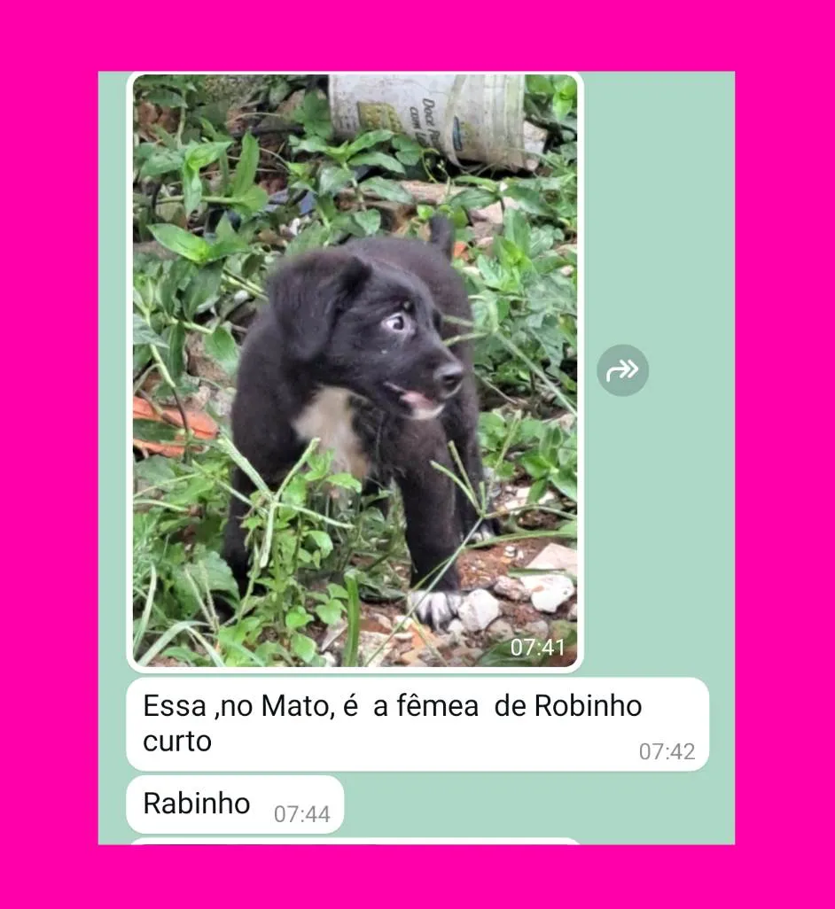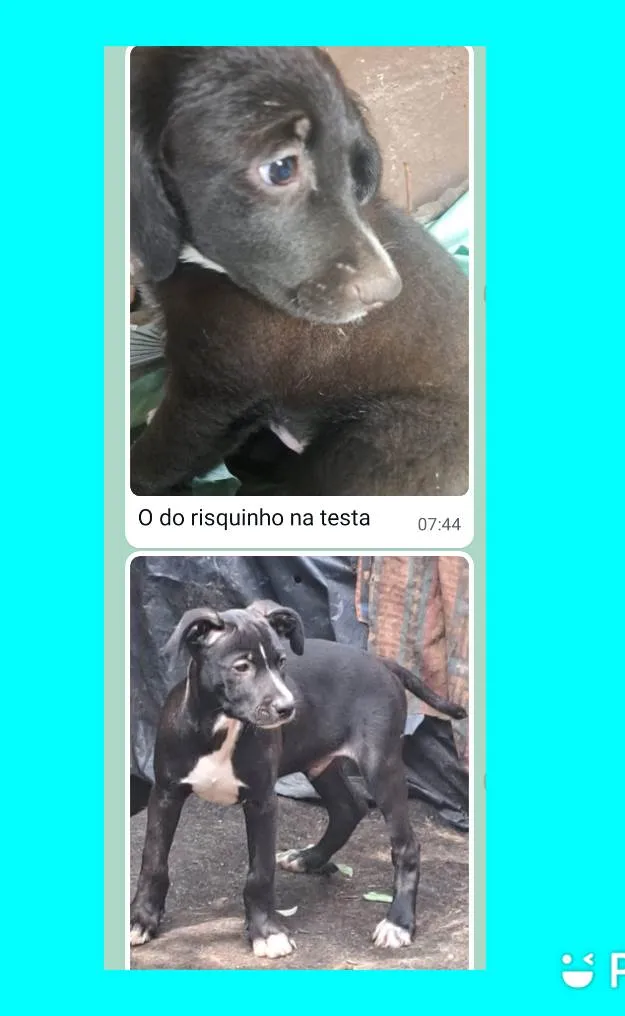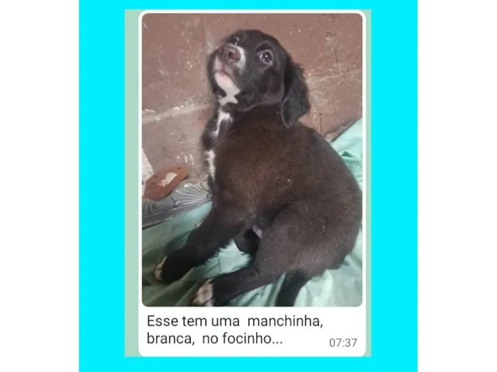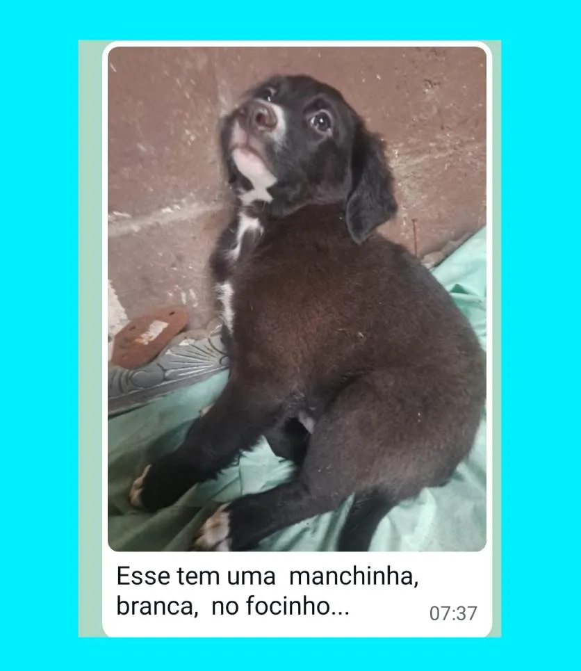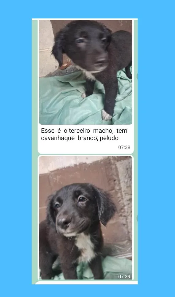 O Sr. Antônio tem 78 anos, e recolheu uma cachorra grávida da rua, que deu cria 7 filhotes , são 4 fêmeas e 3 machos , nasceram em novembro/23, ele procura famílias para esses filhotes, ficarão porte médio, sem raça definida. Mandar WhatsApp para Sr Antônio, (11) 98838-3477 ou 11 99670-0342, ou pode mandar msg nos 2 números, ele conversa e combina a entrega. As fêmeas são 4;Branca pelo curto, Marrom escuro pelo curto, Toda preta peluda , preta peluda ponta das patas brancas e tem o rabo curto.Agora a descrição dos 3 machos : preto c risco na testa e pelo curto brilhante , preto peludo com mancha branca no focinho e ponta das patas brancas ,preto peludo com mancha branca do peito ate o queixo.