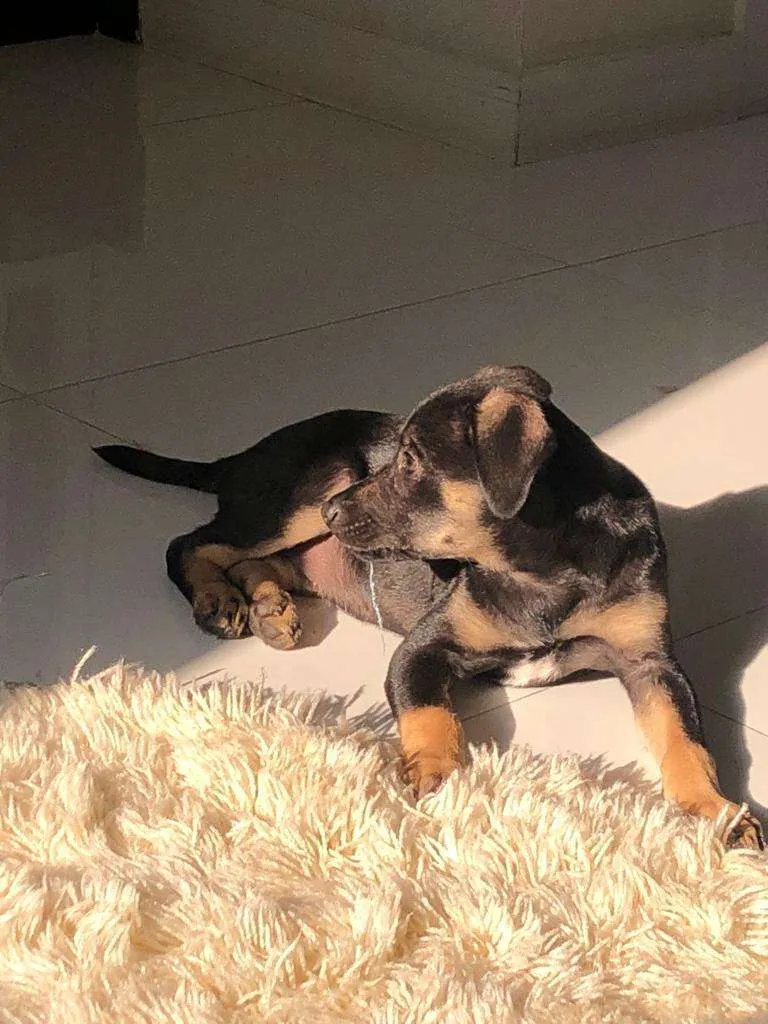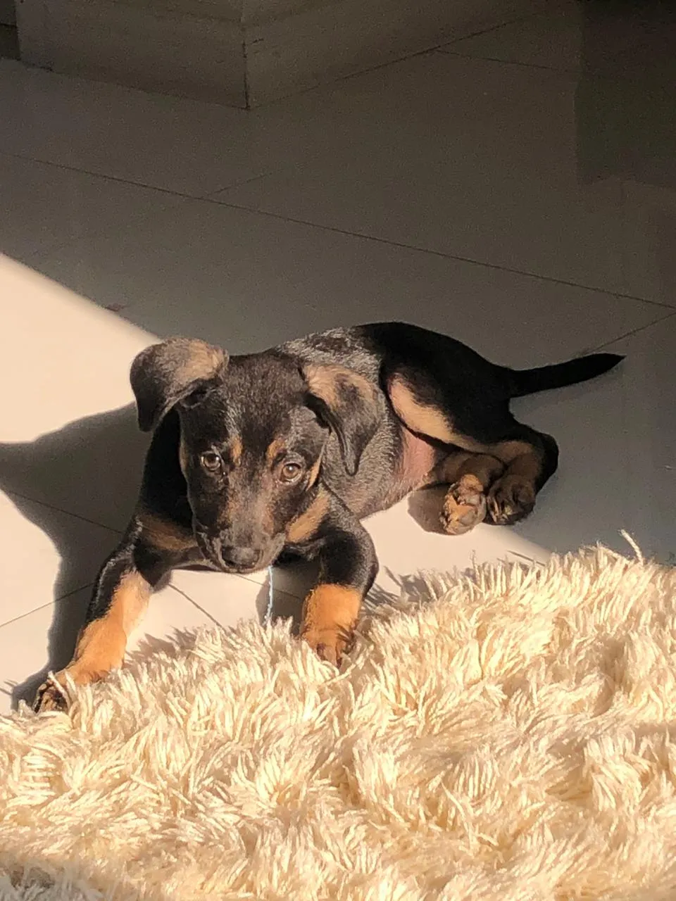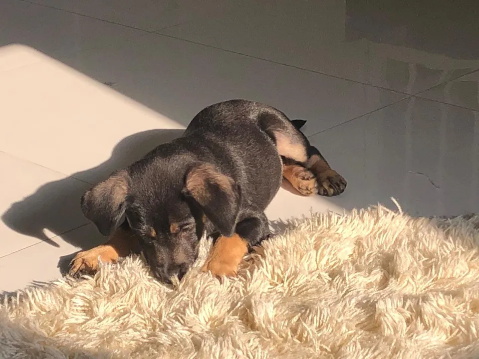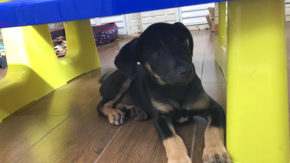 Cachorra filhote com 3 meses - preta com patas beges, pelo baixo, mansa, carinhosa, muito boazinha.