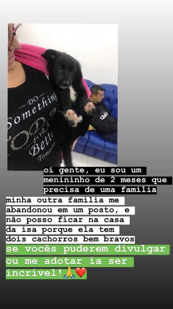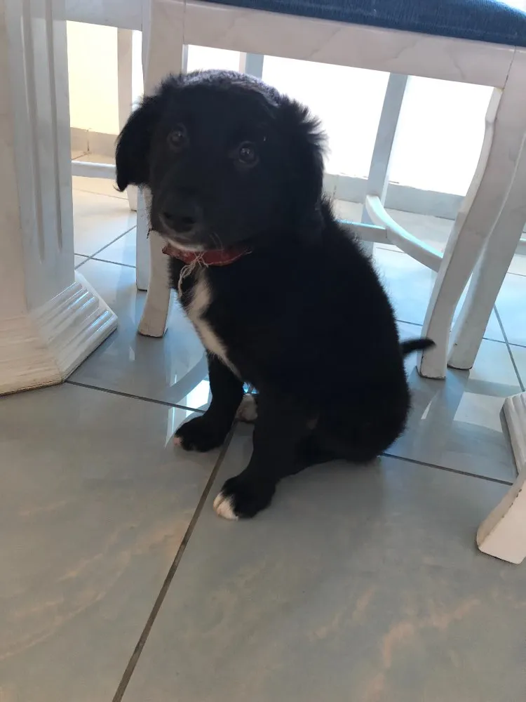 Filhote, aproximadamente com dois meses, preto com detalhes brancos, apaixonante. Eu o encontrei em avenida quase sendo atropelado, e estou procurando um dono que queira receber muito carinho, pois já tenho dois cachorros e são bravos, não gostaram da presença dele.
