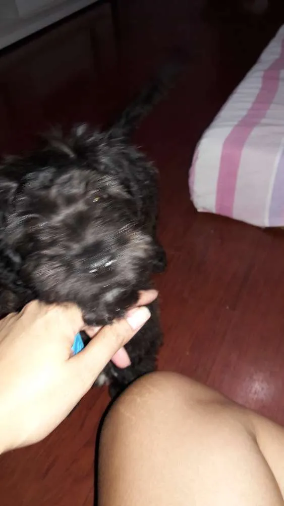 Cao brincalhao, nunca atacou ninguem da casa, inclusive minha bebe de 1 ano. Infelizmente nós nao nos adaptamos a rotina de um caozinho. Ele esta sendo criado no quintal, mas adora um quentinho dentro de casa tambem. Eu adotei e vi fotos dos pais, a mae uma pudlle branca pequena e o pai um cocker preto pequeno. Nao deve crescer mais do que ja esta.