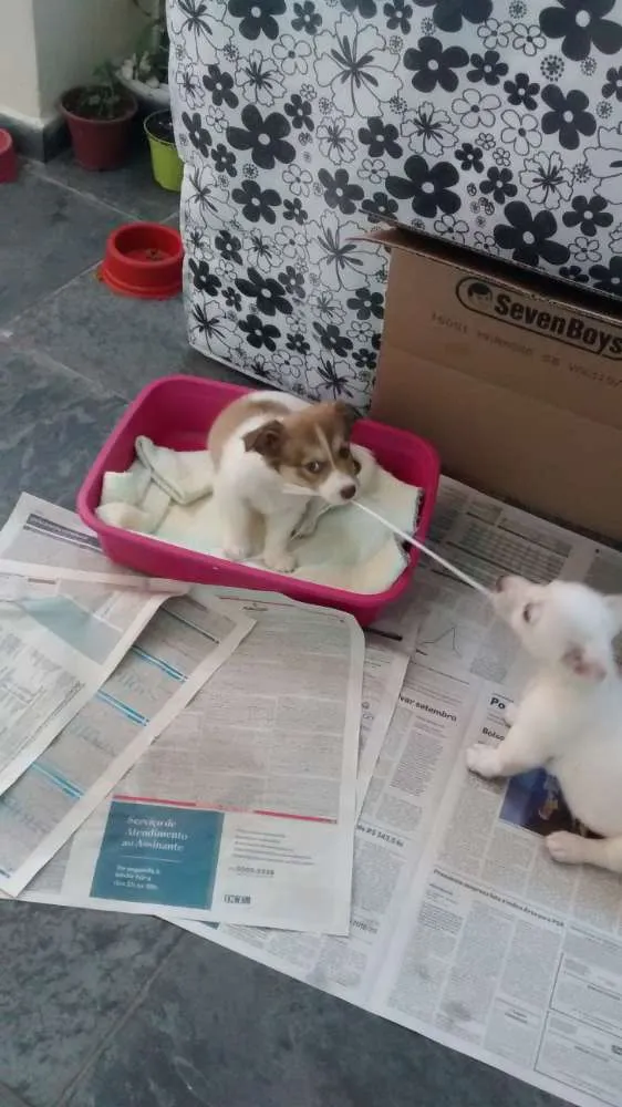 Estou doando dois filhotes de cachorro uma fêmea e um macho ela é branca com caramelo e olhos verdes e macho é branco com olhos pretos são muitos lindos e carinhosos whatsapp 11941274870