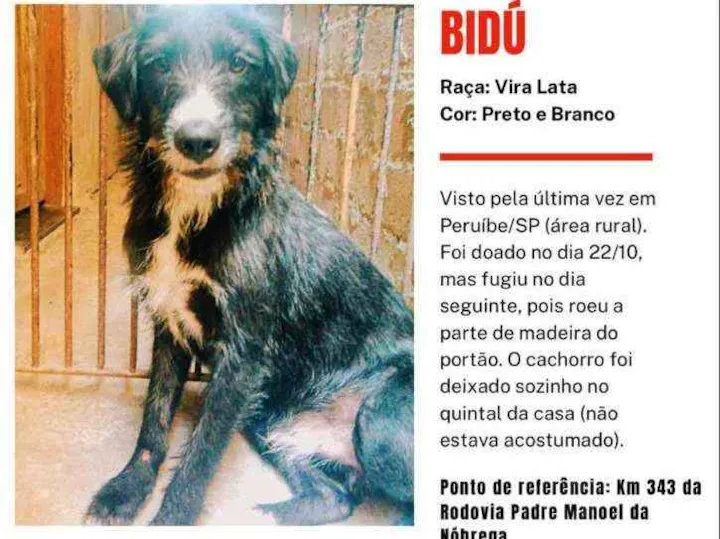 Bidú foi doado para um casal que mora em uma chßcara em Peruíbe, litoral Sul, distante da cidade. Foram avisados que o cachorro não fora criado no quintal, e poderia fugir, uma vez que o terreno é arenoso e eles cavam e passam por debaixo do portão. Na primeira noite que passou lá ficou sozinjo num lugar estranho escuro, A chácara fica perto do Km 323 da Rodovia Padre Manoel da Nóbrega.Se alguém tiver notìcias entrar em contato no fone: 991061149.Falar com Eleonora.