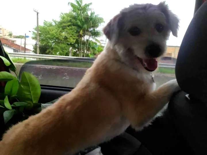 Cachorro porte médio, pelagem amarela/loira e está com um Machu na parte interna da orelha
