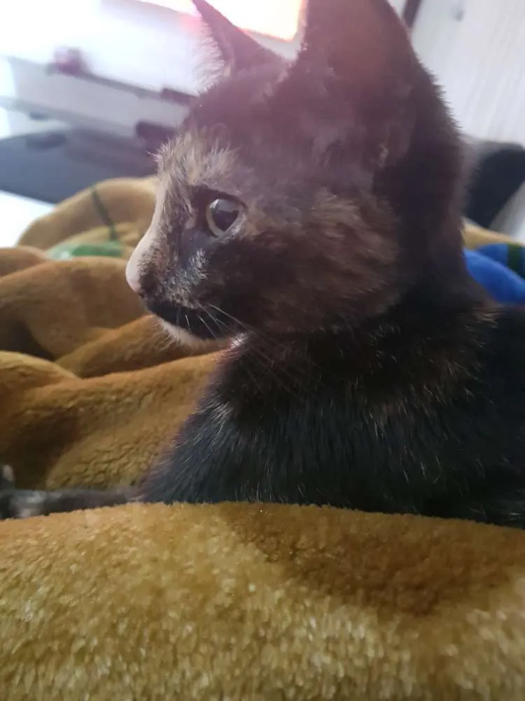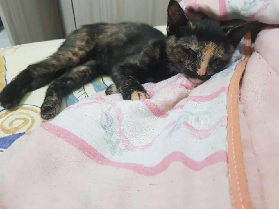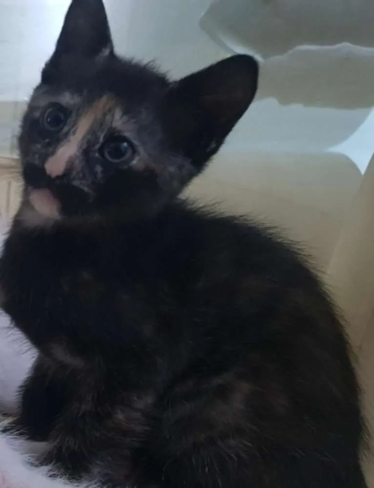 Me chamam de Flora aqui no meu lar temporário, sou uma menininha e tenho 4 meses. Minha tia adotou minha mãe e depois de um tempo eu nasci! Minha tia acha que por causa da minha cor, ninguém quis me adotar. Sou muito bem cuidada, mas não posso ficar aqui porque minha tia já tem muitos outros animais. Sou muito brincalhona, amorosa, companheira e corajosa. Já tomei uma dose de vermifugo, uso a caixinha de areia, como ração e amo receber carinho quando estou deitada. Se você puder me adotar ou souber alguém que queira, chama minha tia no Whatsapp (11)95425-0408.