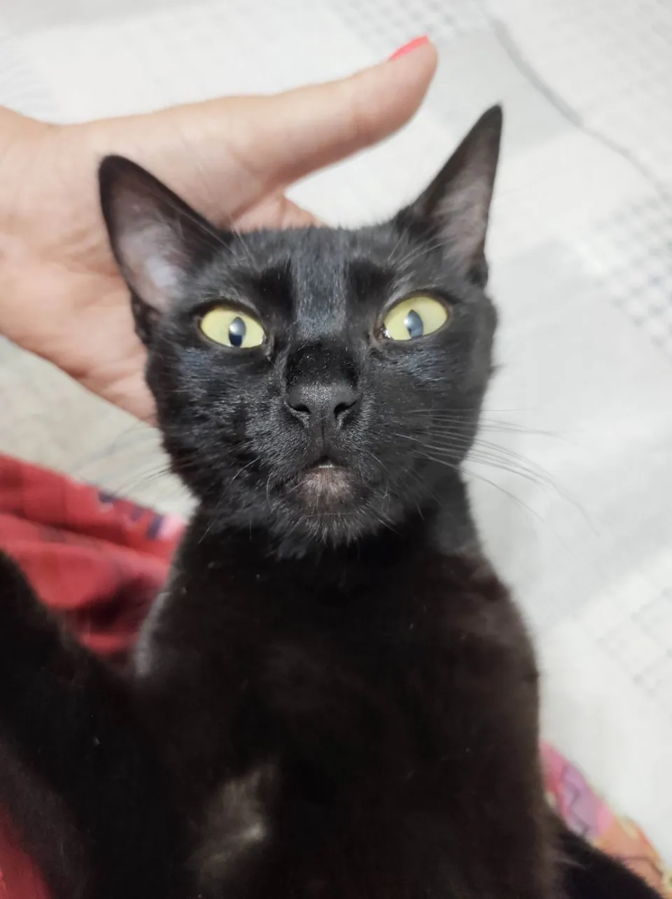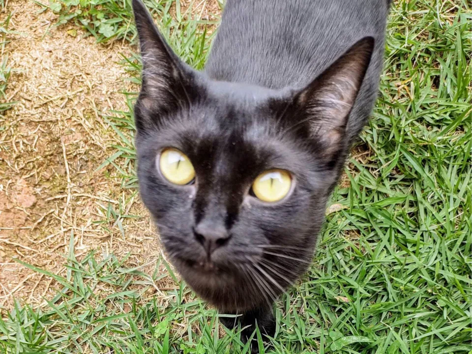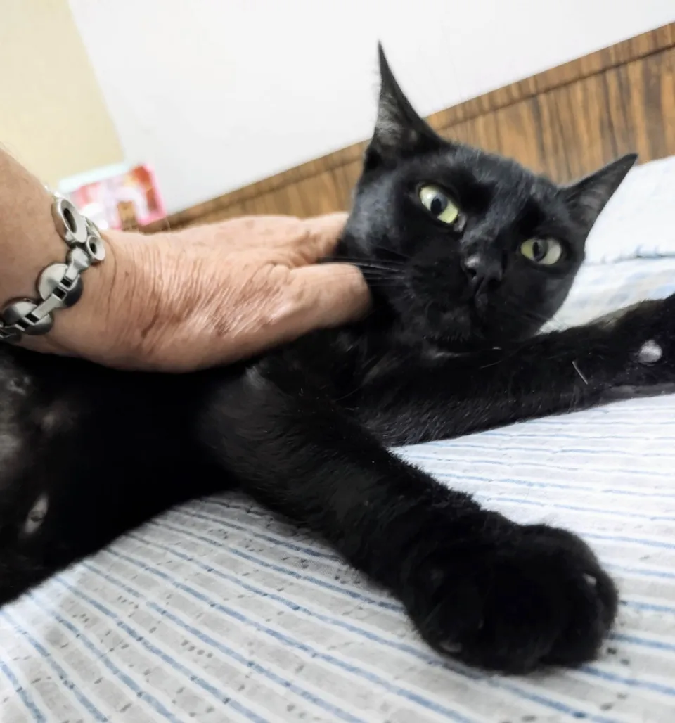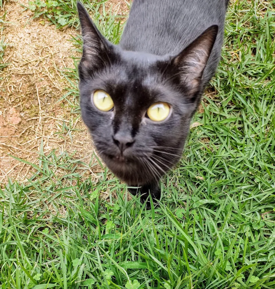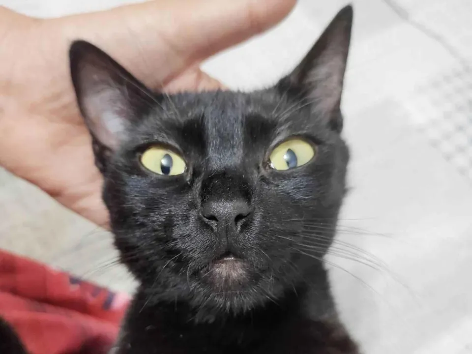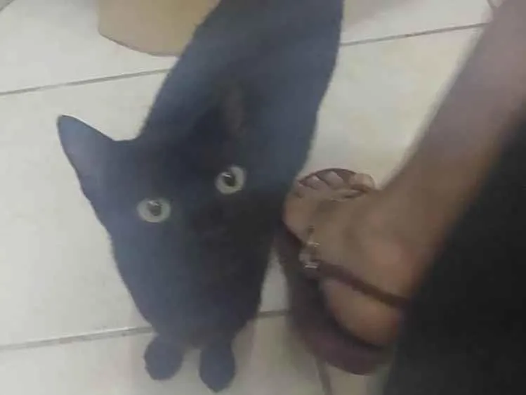 Gatinha preta resgatada na rua com a ninhada, agora reabilitada, tem cerca de 7 meses de idade e é muito carinhosa, adora pessoas e colo, precisa de família agora