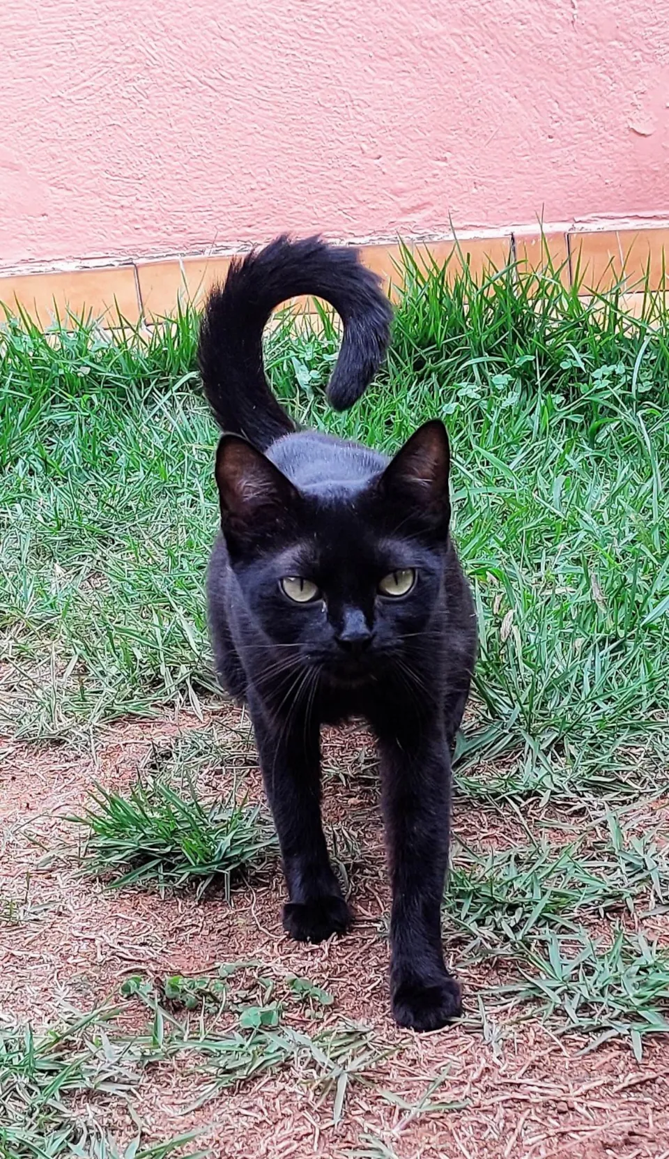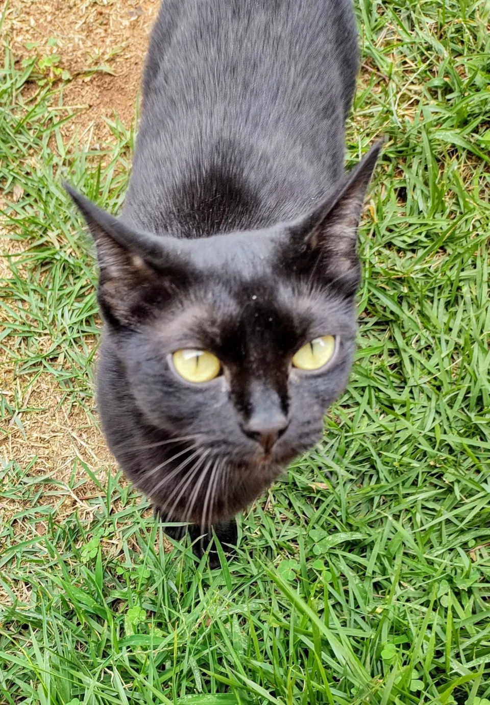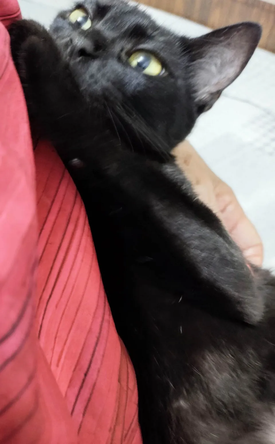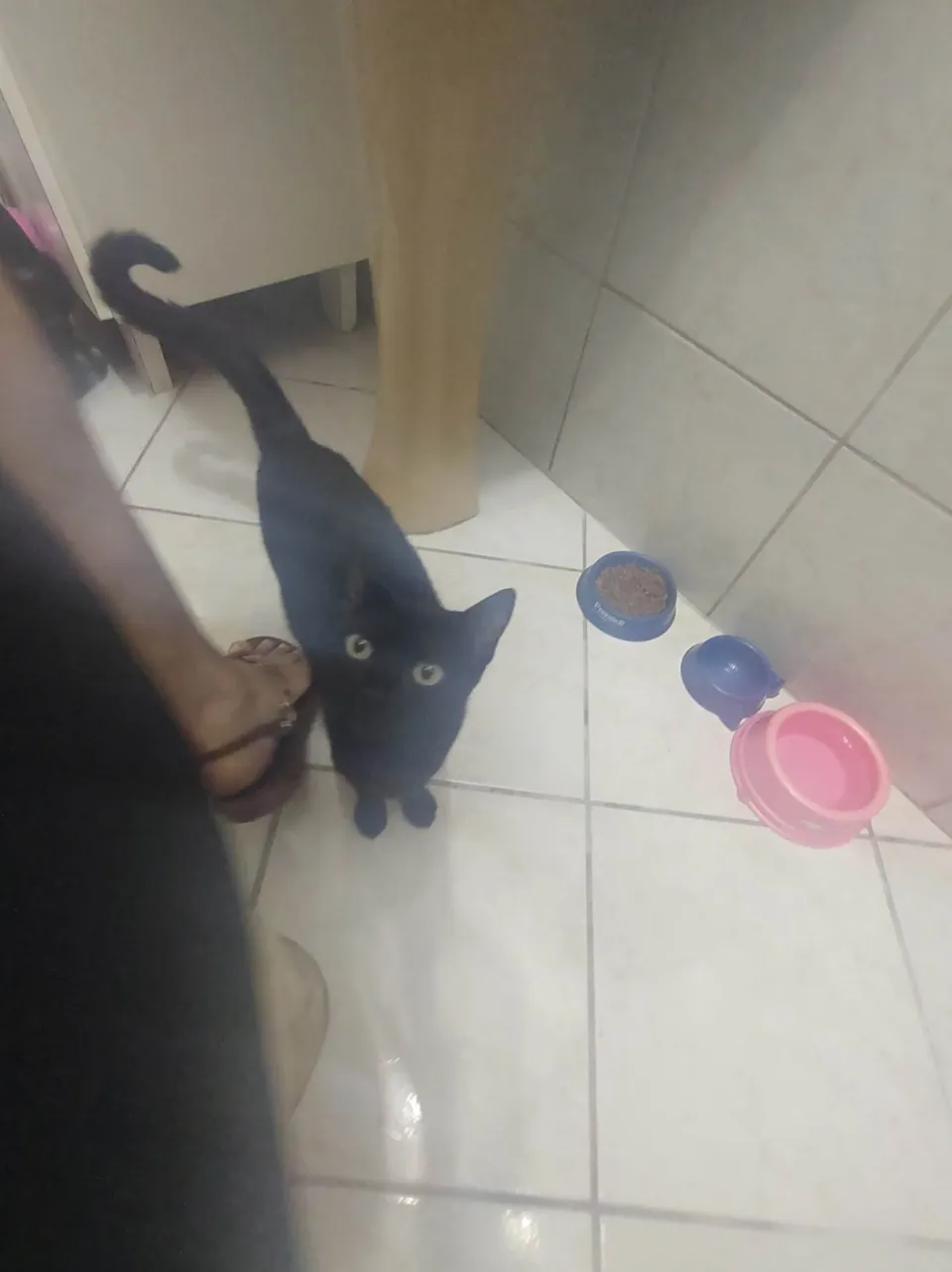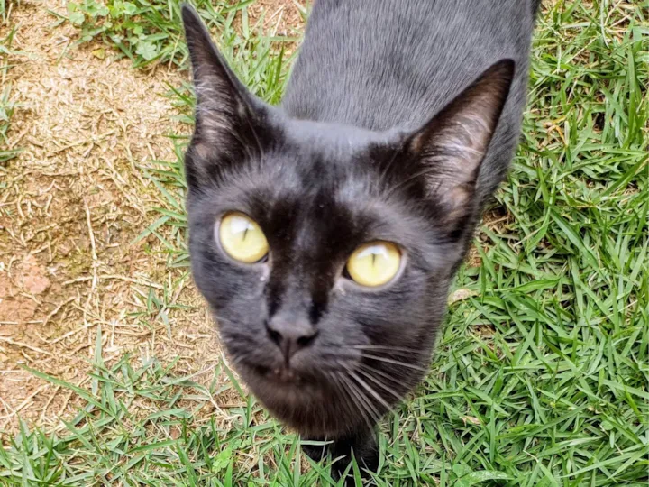 Gatinha preta resgatada na rua com a ninhada, agora reabilitada, tem cerca de 7 meses de idade e é muito carinhosa, adora pessoas e colo, precisa de família agora