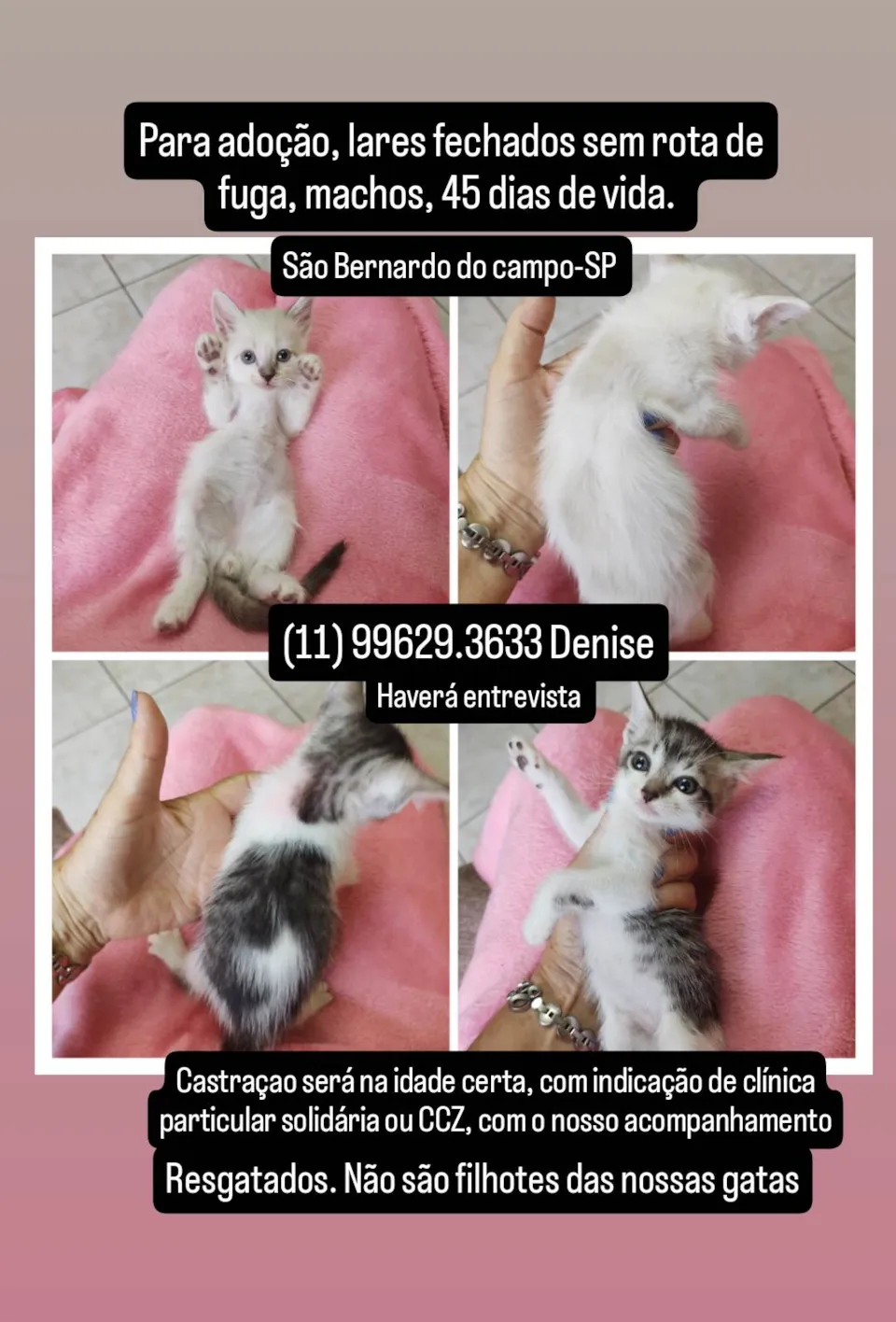 Esse gatinho machos de +-45 dias foi resgatado do abandono, vermifugado e despulgado , esta p adoção para lares sem rota de fuga, pode ser apartamento ou casa, desde que não tenham acesso à rua.. falar com a Denise, Cel (11) 99629.3633 pelo whatsapp. A castração será apenas na idade certa pois são muito bebês, vamos indicar clínicas com preço popular ou poderemos verificar castração gratuita pela prefeitura de São Bernardo do Campo