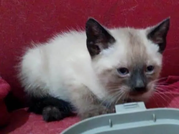 Ele é cinza clarinho com manchinhas cinza escuro na orelha, nariz e nas patinhas