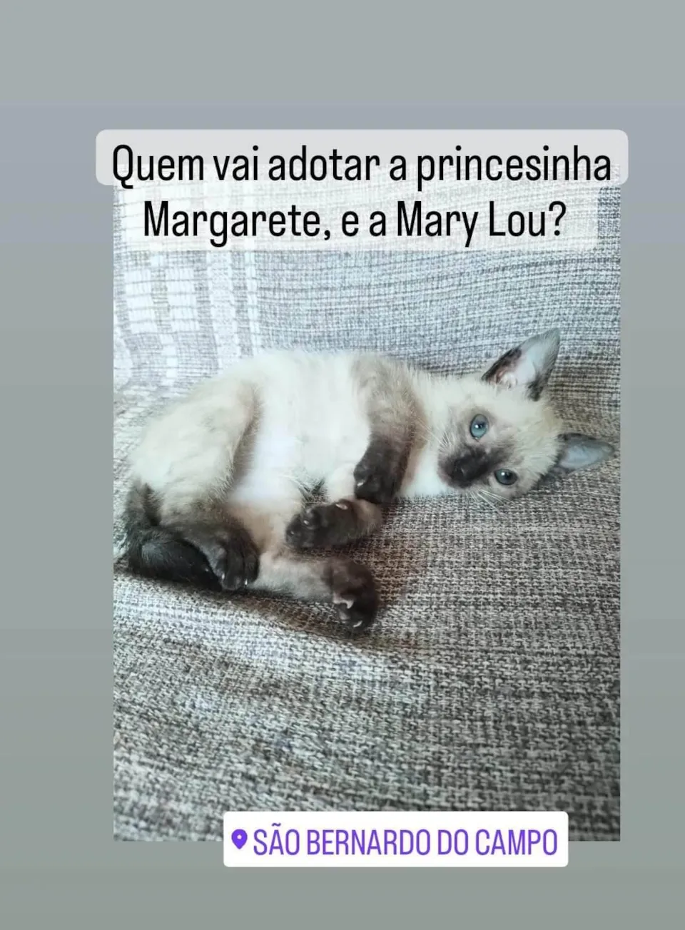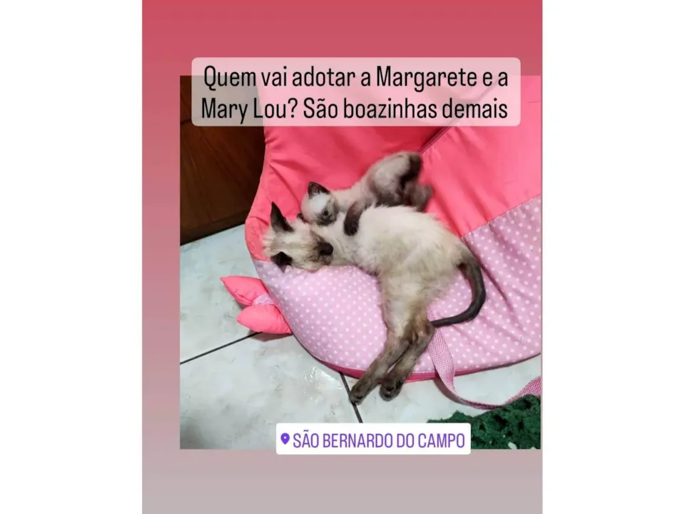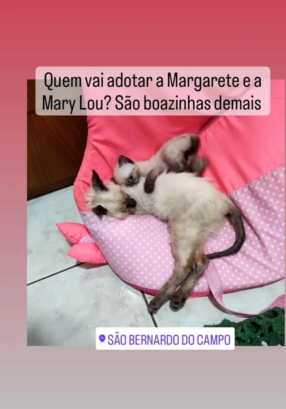 Margarete é uma bebê de 60 dias e a Mary Lou tá com 3,5 meses, ambas foram resgatadas e tratadas, vou acompanhar o adotante para fazer a castração em clínica popular daqui uns meses. São muito amorosas e não se desgrudam, eu queria um lar pra adoção conjunta, lugares fechados sem acesso a telhados, rua, etc ou Apto telado.