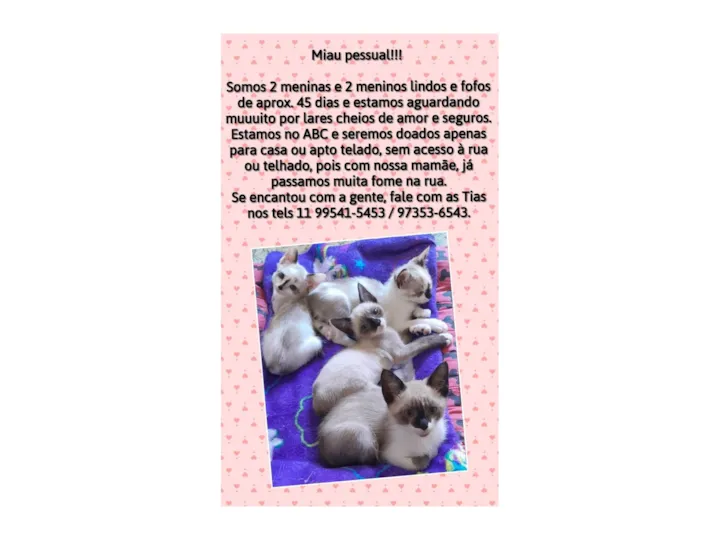 4 lindos filhotes que passarm fome na rua com sua mamãezinha, esperam por um lar de verdade, cheio de amor e cuidados. Serão doados apenas para lares seguros, telados, que não tenham acesso à rua ou telhado.