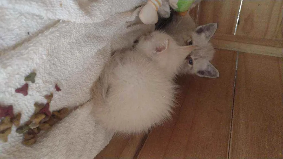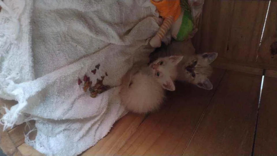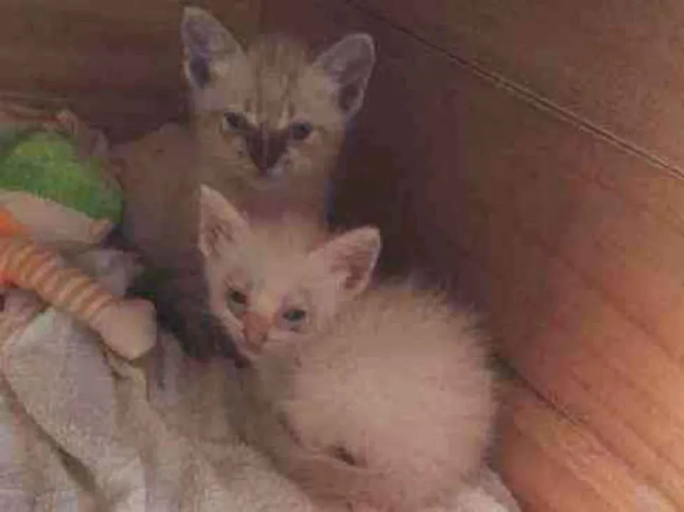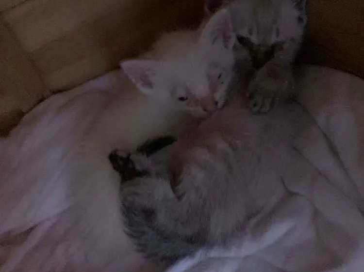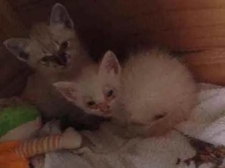 Encontrei eles dentro de uma caixa na rua, procuro um dono(a) pra eles a gata branca com orelha amarela e fêmea e o gato branco com a orelha cinza e macho