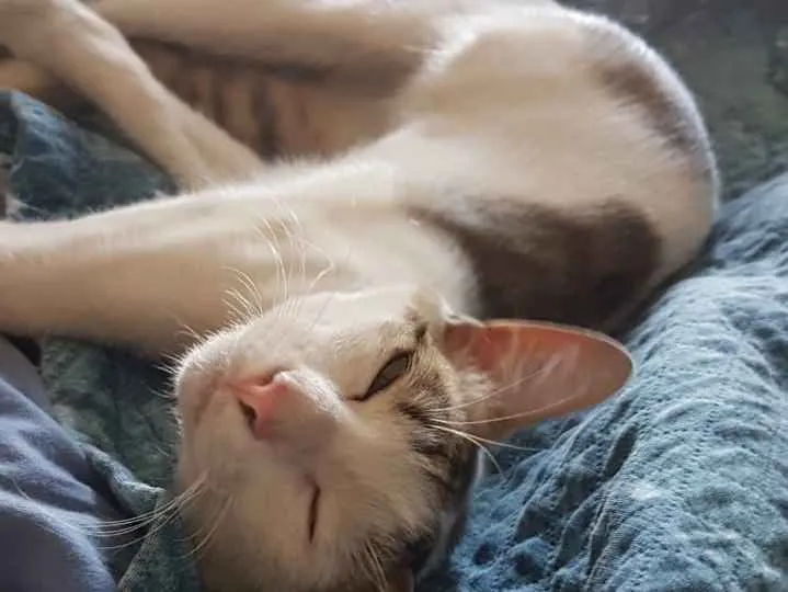 Branco com manchas tigradas cinza , olhos verdes, pelagem curta