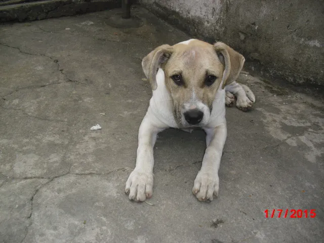 Tem 6 pra 7 meses, porte médio/pequeno.