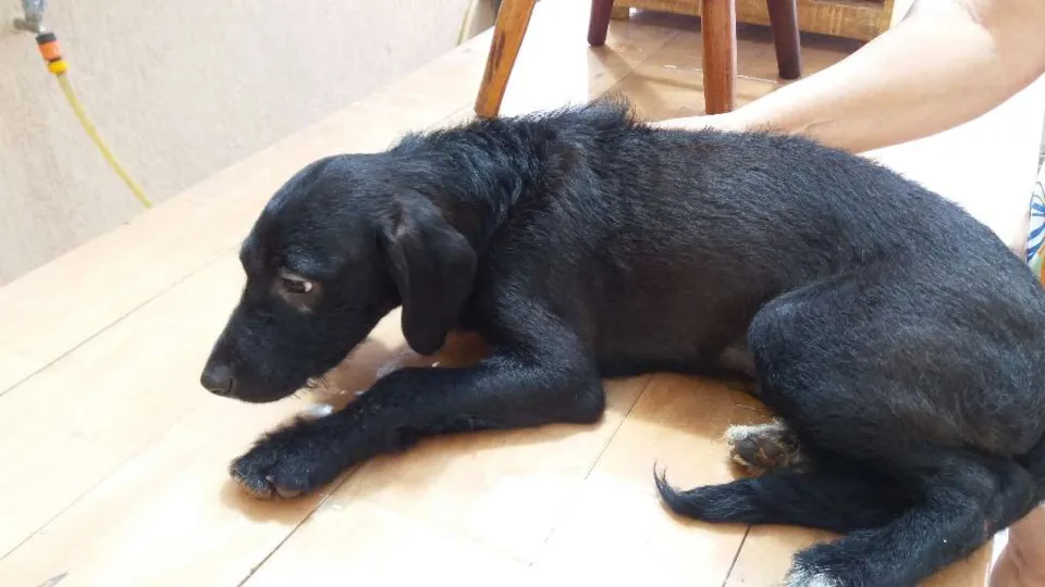 resgatado em 10/02/2018 no Bairro boa Vista em S.C.Sul. Já passamos no veterinário, saúde perfeita, um pouco assustado, já se adaptou conosco, mas temos duas cachorras que não se adaptaram, precisamos doar urgente. Muito dócil, limpinho e muito carinhoso. Já recebeu primeira dose do vermífugo.