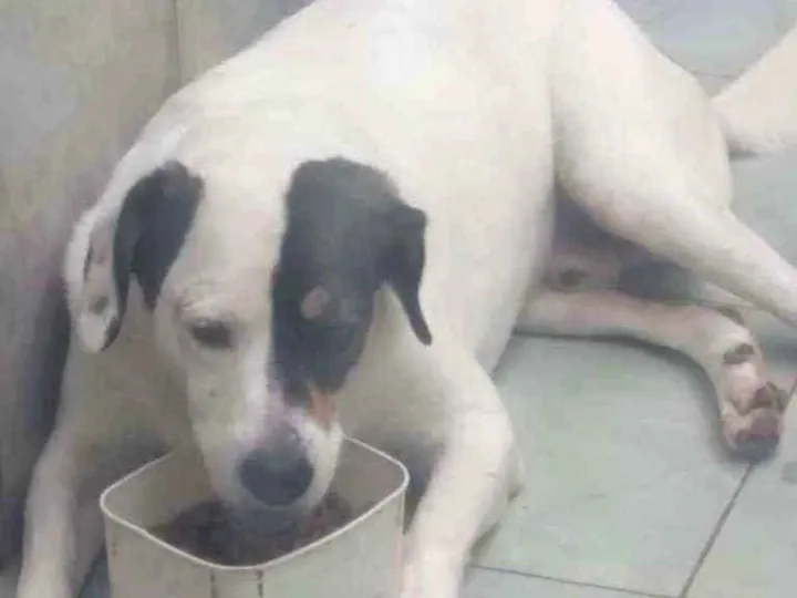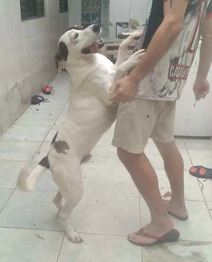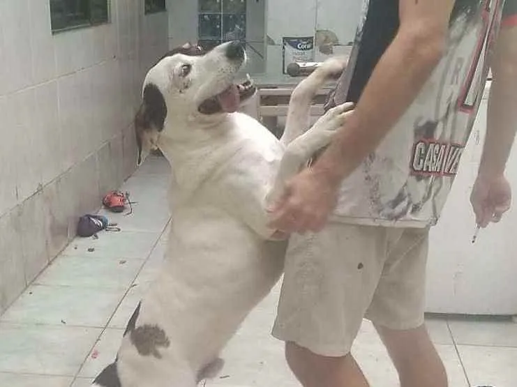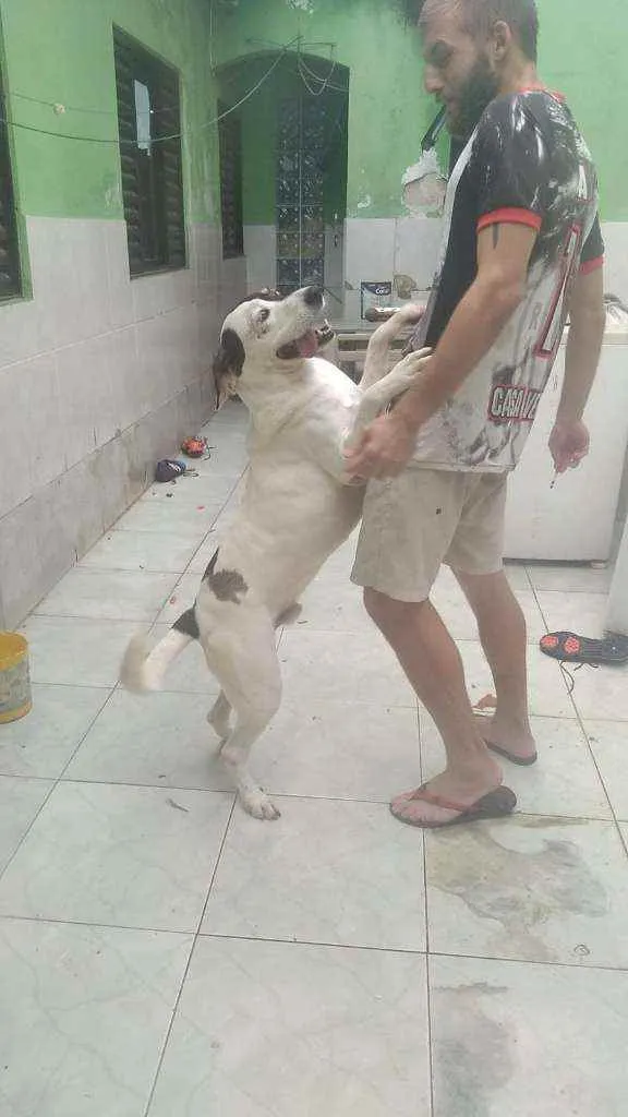 Zeca, pitbull pirata branco mix, castrado e vacinado, em torno de uns 2 anos. Se dá bem com fêmeas, mas com machos não.
