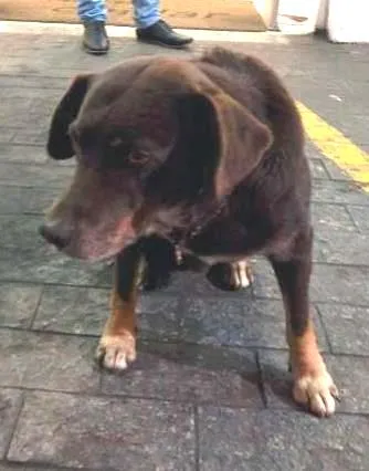 Ele é marrom escuro tem o rabo cortado e é deficiente auditivo. Tem por volta de 12 anos.