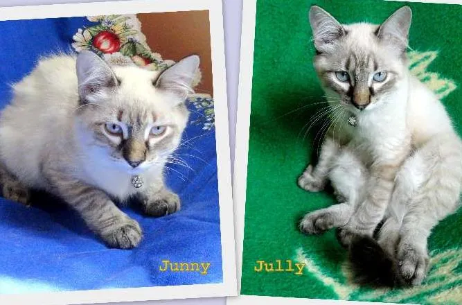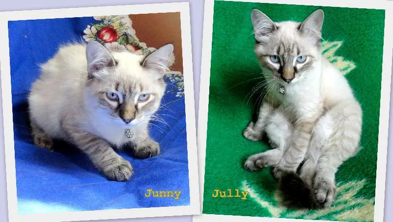 Jully e Junny são duas irmãs gemeas (uma de rabinho comprido e outra de rabinho mais curto) que não se separam, são carinhosas e brincam juntas sempre! Estão com 4 meses e meio a cinco, castradas, vermifugadas e prontinhas para serem adotadas juntas! Estamos em SP