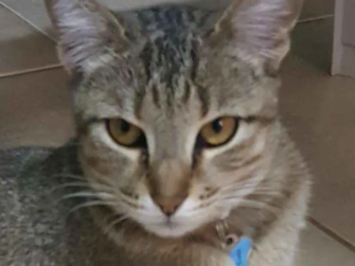 Ela é rajadinha e usa uma coleira cor de rosa