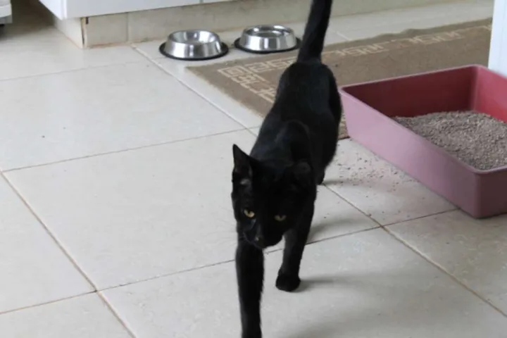 Gato macho Preto (com uma pequena mancha no peito e embaixo da perna esquerda dianteira) abandonado no estacionamento do Tenda São Carlos. Estava muito magro e com fome. Foi dado banho, será castrado, vermifugado e posteriormente vacinado.