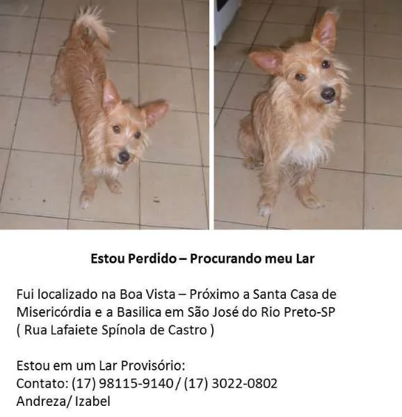 Localizei este cachorro, que esta perdido ou abandonado, na Boa Vista - Próximo a Santa Casa de Misericórdia e a Basílica em São José do Rio Preto-SP (Rua Lafaiete Spínola de Castro), me ajudem a divulgar para ele encontrar seu lar ou encontrar um novo lar. Estou cuidando dele, mas moro em um apartamento e já tenho uma gata e eles não estão se dando muito bem, cada um tem que ficar trancado em um quarto para não termos problemas, então não posso ficar com ele, estou em busca de seu dono ou de alguém que se proponha a cuidar dele com carinho. Ele é dócil,carinhoso e obediente. Ajudem a localizar seu dono ou um novo lar para ele.