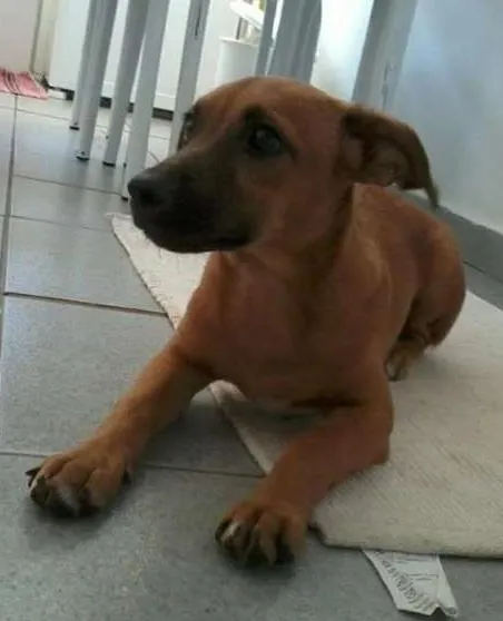 Cadela de pequeno porte com pelagem curta de cor amarela. Tem idade de aproximadamente 3 meses. Tem caracteristicas de Basset. Dócil, amigavél, calma, tranqulia.