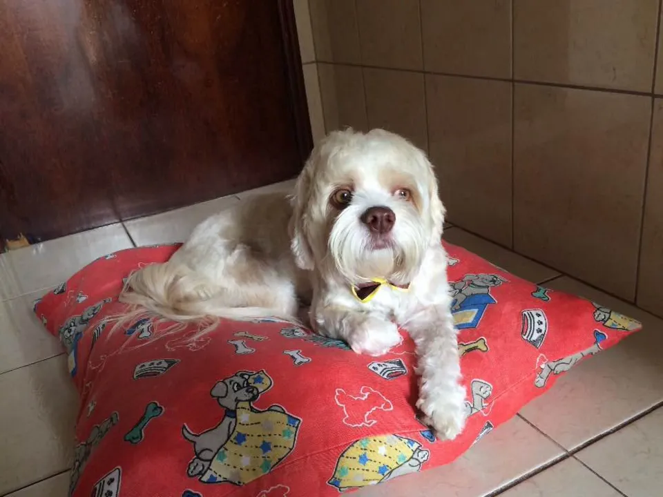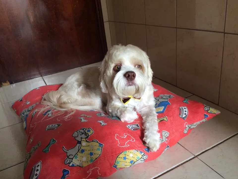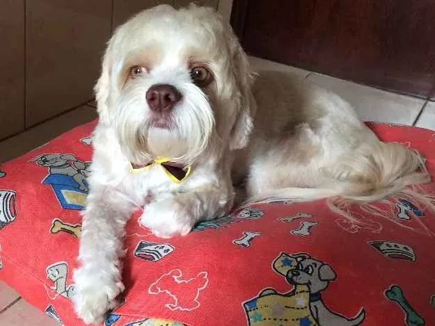Cão de tamanho médio, lhasa apso, cor bege clara, olhos verdes e fucinho marrom. Gosta de companhia, brincar e caminhar. Excelente saúde, bem cuidado. Cão com todas as vacinas em dia, vermífugo é anti carrapato e pulgas. Já castrado