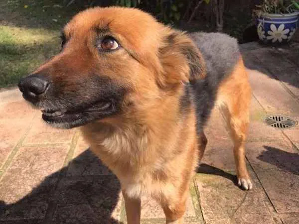 Encontrada na Rodovia dos Tamoios no dia 28 de julho de 2017. Porte médio, pelagem marrom escuro com marrom claro, segundo a veterinária deve ter mais ou menos 2 anos de idade. Parece filhote de pastor alemão. Carinhosa.