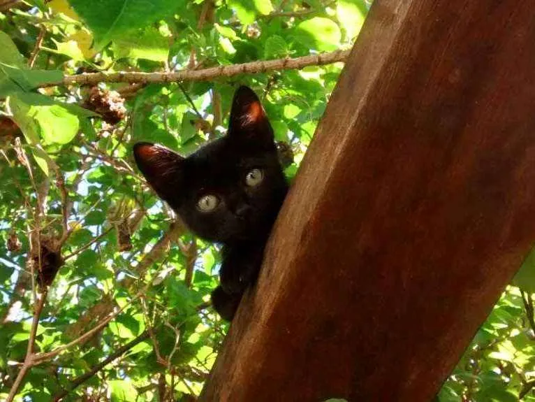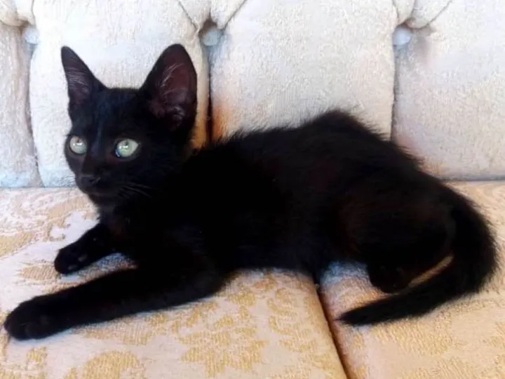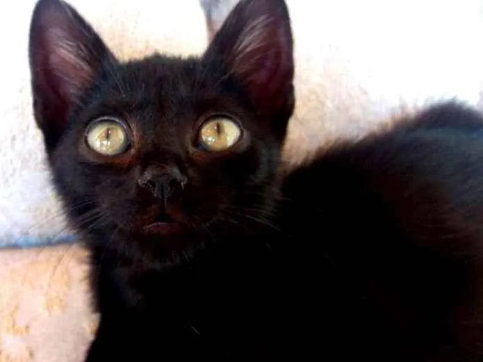 Tem olhos grandes cor esverdeada com linha azulada em torno da pupila. Pelagem preta com uns fios brancos misturados nas orelhas.
