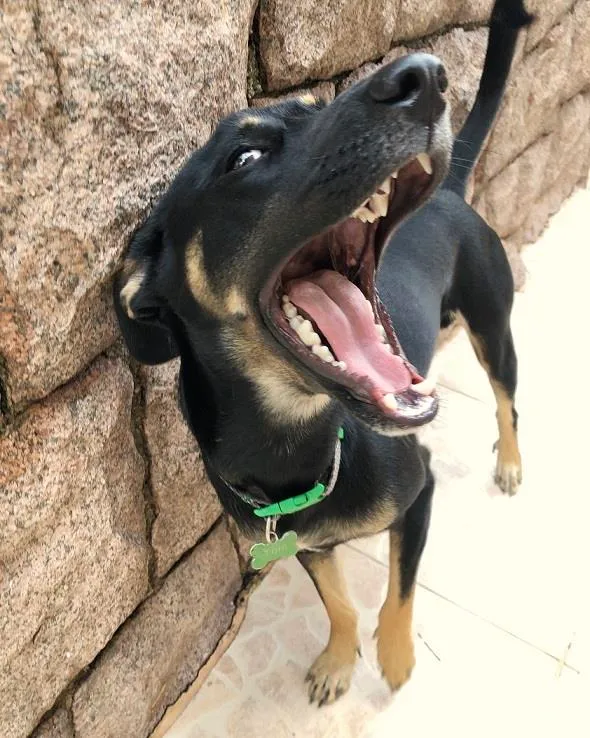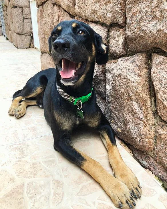 Atualmente está em lar temporário. É um filhotão muito dócil, amoroso e inteligente.