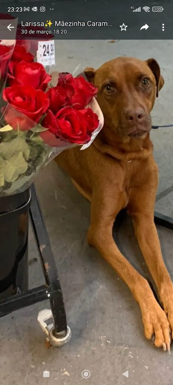 Eu sou a Caramela. Sou jovem, tenho cerca de 1 aninho de idade e peso uns 18kg. Fui encontrada nas ruas, grávida. Tive 6 filhotinhos que estão em processo de adoção. E agora é minha vez de procurar uma família humana para chamar de manhã.