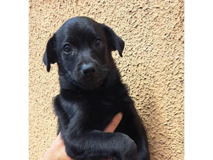 Elza tem 3 meses, pesa 2.5kg. Ja está castrada , vacinada raiva, vermifugada. Adulta deve pesar +/- 12kg porte médio pequeno. Ela é toda preta.