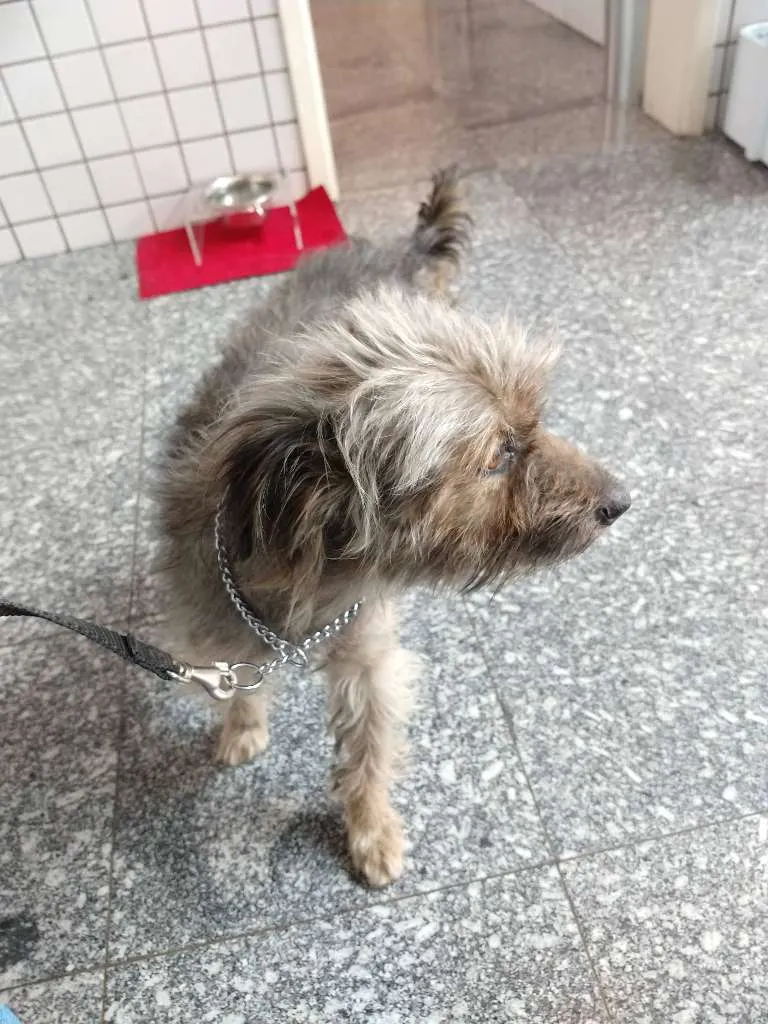 Isabel foi encontrada abandonada num posto de gasolina com muita fome e cheia de pulgas. Levada a uma clinica tomou um banho, fez exame de sangue e aguarda a castração.