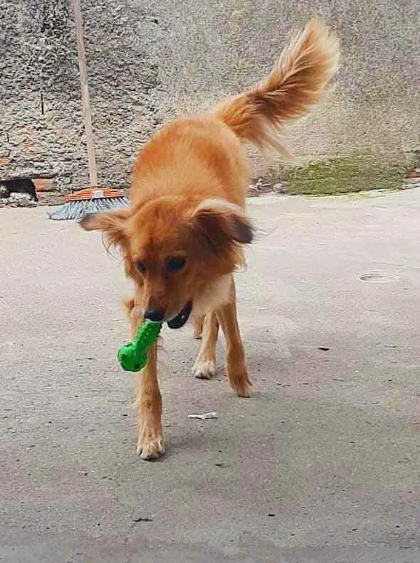 É tranquilo, obediente, também gosta de brincar. Amoroso quando pega confiança.