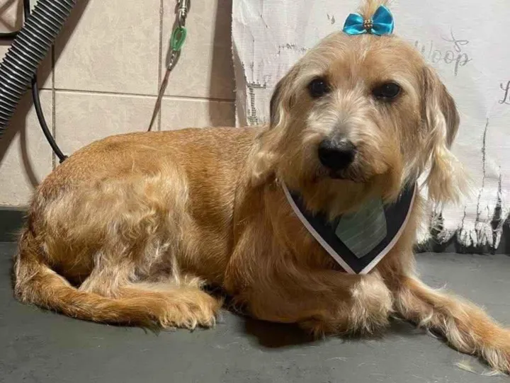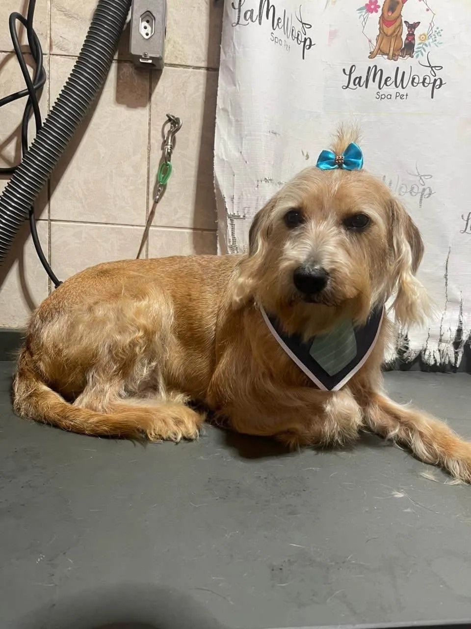 Fui tomar banho e me colocaram um lacinho??Eu sou lindo de todo jeito!!!??Assinado: Loirinho doce, resgatado cambaleando com cinomose, super meigo e bonzinho. Se dá com todos!!!