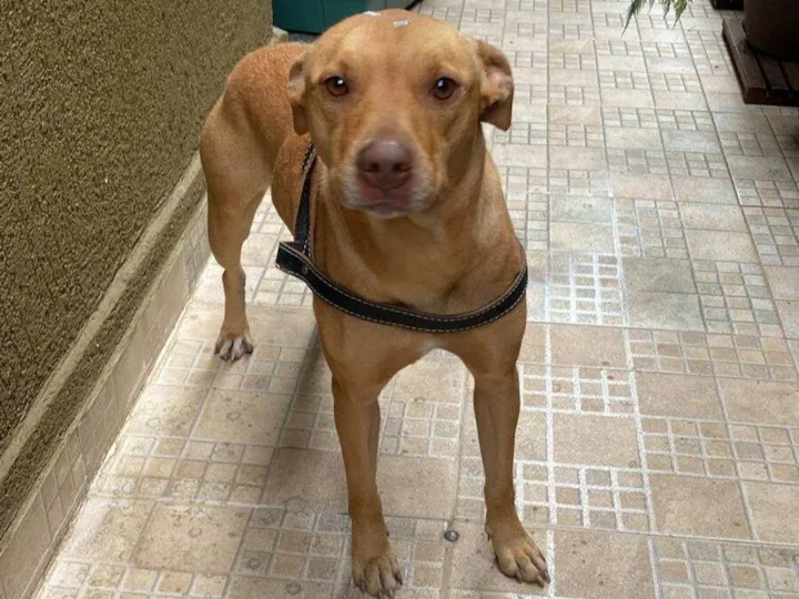 Vira-Lata Caramelo, com mais de 1 ano, porte médio, dócil e desconfiada, foi resgatada após atropelamento e tratada, sem ferimentos graves.