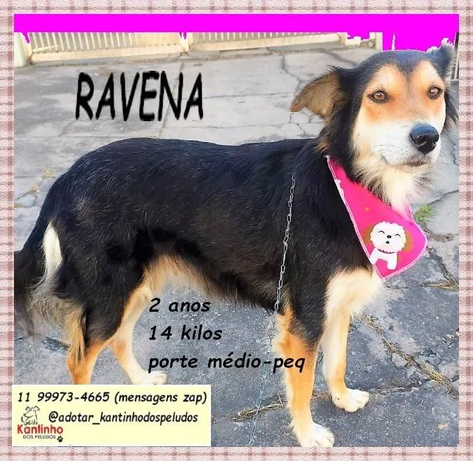 Ravena é uma mocinha encantadora, de olhar doce e jeitinho tranquilo.Com 2 aninhos, 14kg e porte médio-pequeno, ela sonha em encontrar uma família para chamar de sua. Dócil, companheira e cheia de amor pra dar — impossível não se apaixonar!