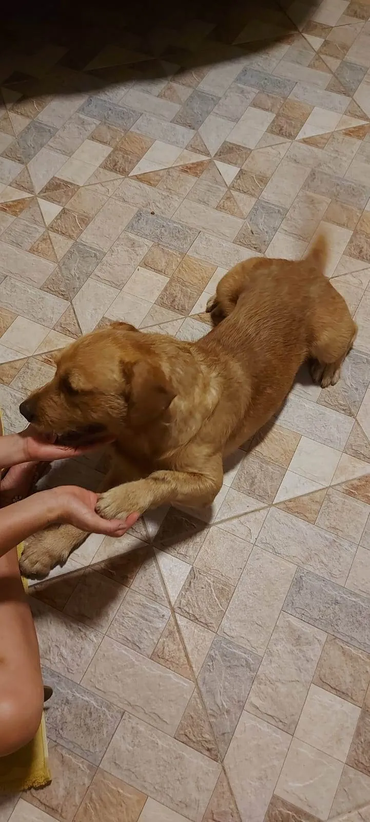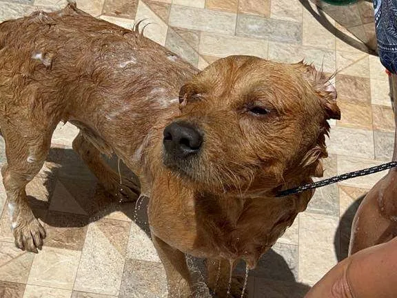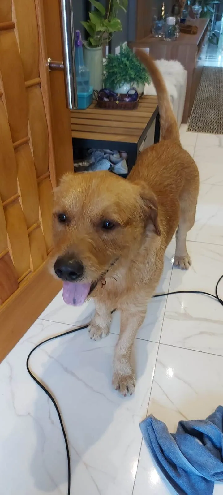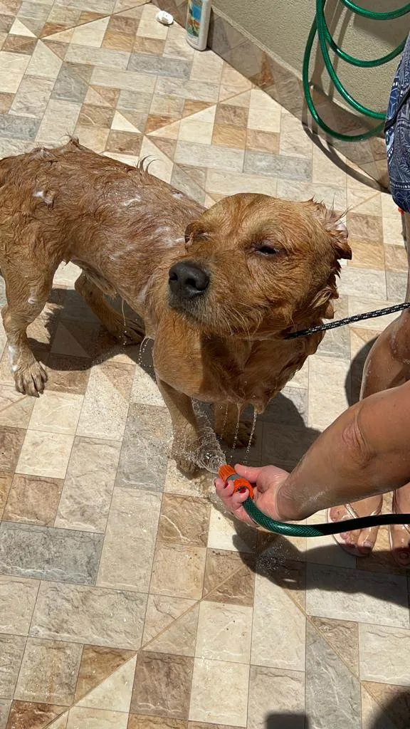 Resgatei o cachorro dia 11.10.23 devido a chuva que ia cair e ele estava a 2 dias perambulando na rua onde moro, cuidei dele com vacinas, banhos, vermífugo, anti pulgas e carrapatos, castrei, estou adestrando. Cachorro dócil, manso, brincalhão e muito obediente. Preciso dar um lar para este peludo.