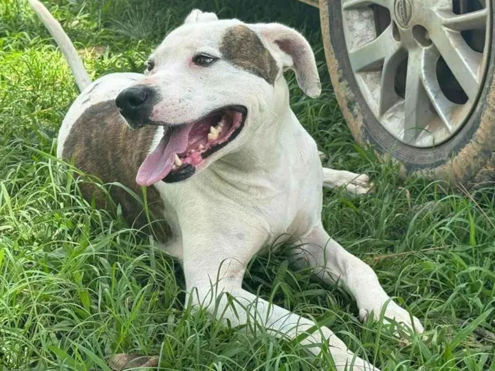 Procurando um novo amigo de quatro patas? Conheça Theo, um lindo Pit-Bull branco de 2 anos de idade. Theo é um grandalhão doce e afetuoso, com um temperamento dócil, calmo e brincalhão. Ele adora a companhia de pessoas e é muito sociável, até mesmo com desconhecidos.