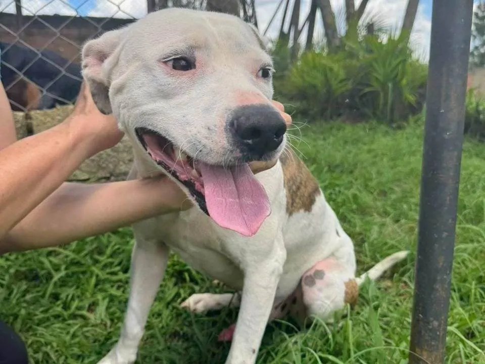 Conheça o Theo, um adorável Pit-Bull macho de 2 anos, com uma linda pelagem branca e porte grande. Ele está castrado, vacinado e vermifugado, pronto para encontrar seu lar definitivo. Theo é um cachorro dócil, calmo e brincalhão, que adora estar na companhia de pessoas. Ele tem um temperamento sociável e se dá bem com desconhecidos, tornando-o o companheiro ideal para qualquer família. Além disso, Theo é bastante adaptável e consegue viver bem tanto em casa com quintal quanto em apartamento. Ele está ansioso para encontrar uma família amorosa que possa proporcionar todo o carinho e atenção que ele merece. Se você está procurando um amigo leal e divertido, Theo é o cão perfeito para você. Venha conhecê-lo!